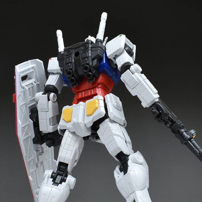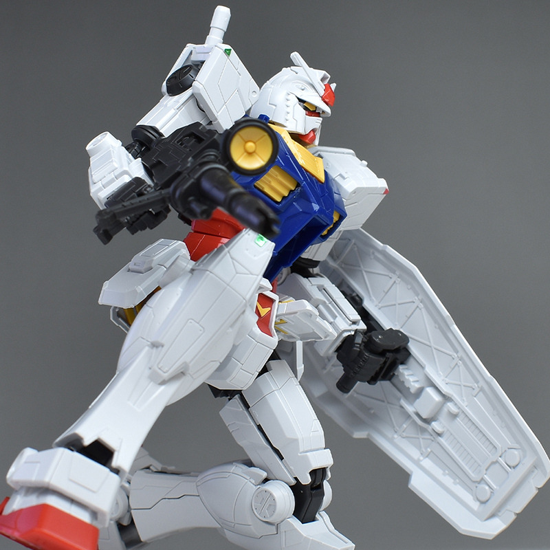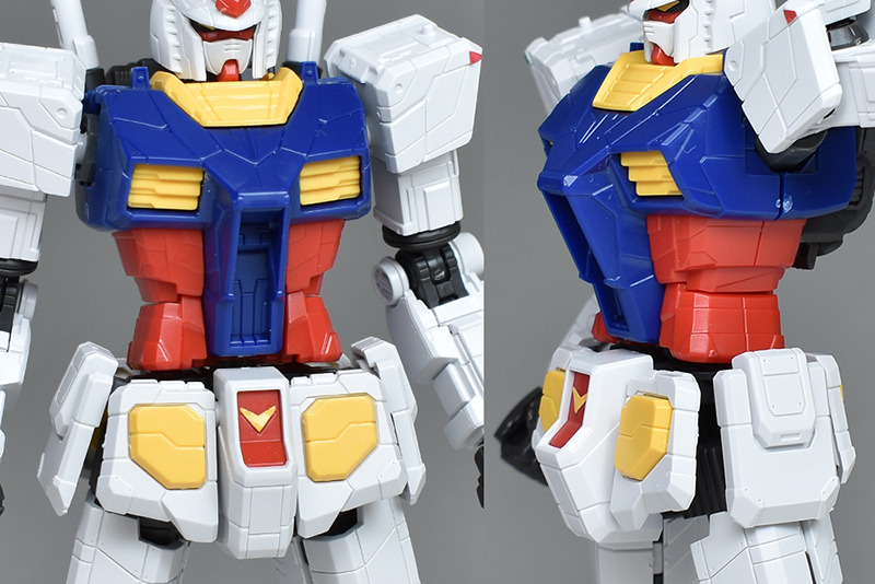 다만, 실물이 움직이는 건담의 칼라링을 재현하는 경우는 흉부를 라이트 블루, 복부를 진한 레드, 허리 헬륨 코어를 진한 옐로우로 색으로 구분해, 한층 더 전신 각부에 있는 몰드를 그레이나 라이트 그레이 등에 칠할 필요가 있습니다. 덧붙여서 1/100 RX-78F00 건담 은 각부의 그레이 몰드는 씰로의 색 분할이었습니다.