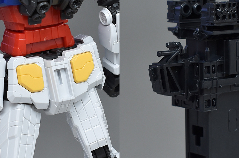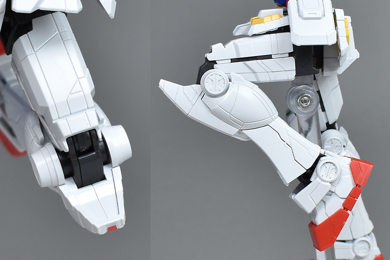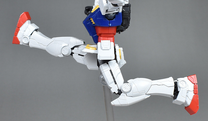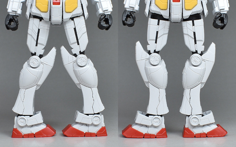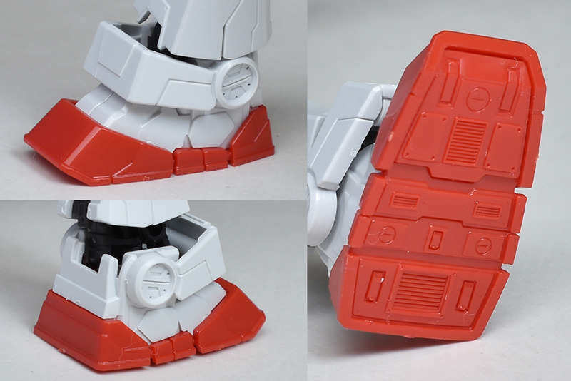 다리부도 실루엣은 통상의 RX-78-2에 가깝습니다만, 몰드가 특수로 조금 바뀐 디자인이 되어 있습니다. 팔 부분과 마찬가지로 무릎의 센서(오른쪽 무릎이 그린, 왼쪽 무릎이 레드)만 씰로 색으로 구분하여 각 부 장갑의 회색이나 라이트 브라운은 도장이 필요합니다.