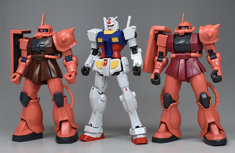 김에 HG샤아 전용 자쿠Ⅱ와 나란히. (이미지 왼쪽이 구 키트 , 오른쪽이 리메이크 버전 입니다.) 역시 최근의 건담이라면, 구 키트의 샤아자크와 맞추기에는 조금 무리가 있을 것 같습니다.
