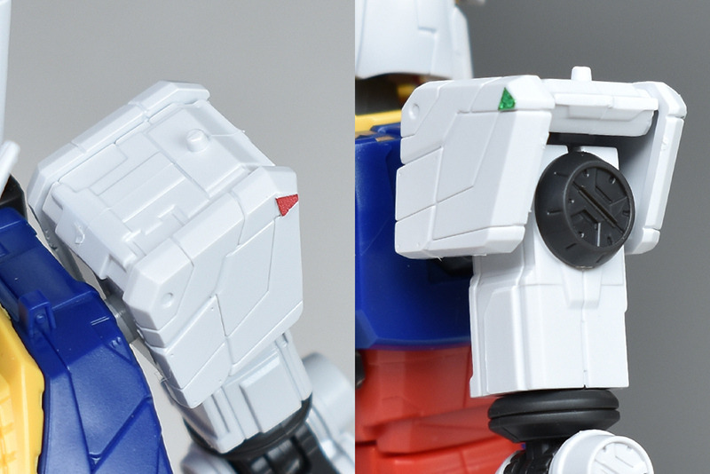 숄더 아머는 전후·중앙의 3장 파트 구성으로, 합목은 끝에서 몰드화되고 있습니다. 모서리의 센서(오른쪽 어깨는 그린, 왼쪽 어깨는 레드)는 씰로의 색으로 구분입니다만, 안쪽 모서리의 몰드는 그레이에 칠해가 필요합니다. 두 팔에는 다크 그레이 성형색으로 색으로 구분된 원형 몰드가 조형.