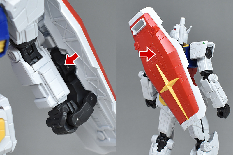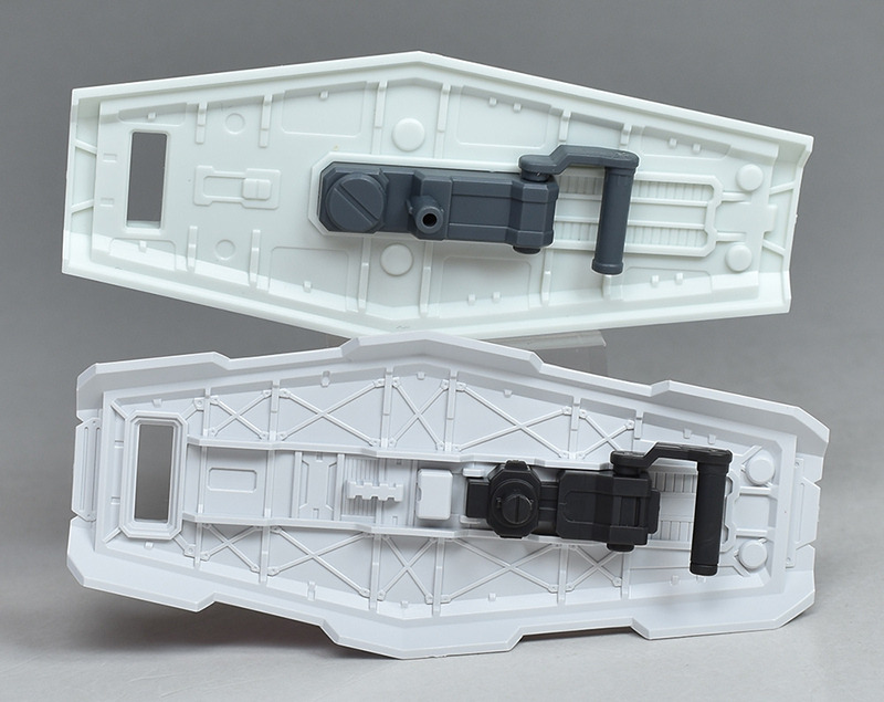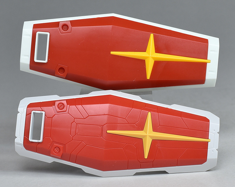 실드를 REVIVE판의 것과 나란히 비교. 사이즈적으로도 실루엣적으로도 그다지 차이는 없습니다만, F00의 것은 표면에 복잡한 몰드가 들어가는 등 개성적인 디자인이 되고 있습니다. 뒷면도 그물 모양의 몰드가 조형.