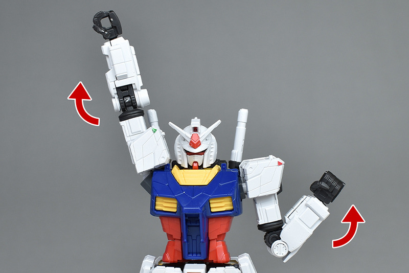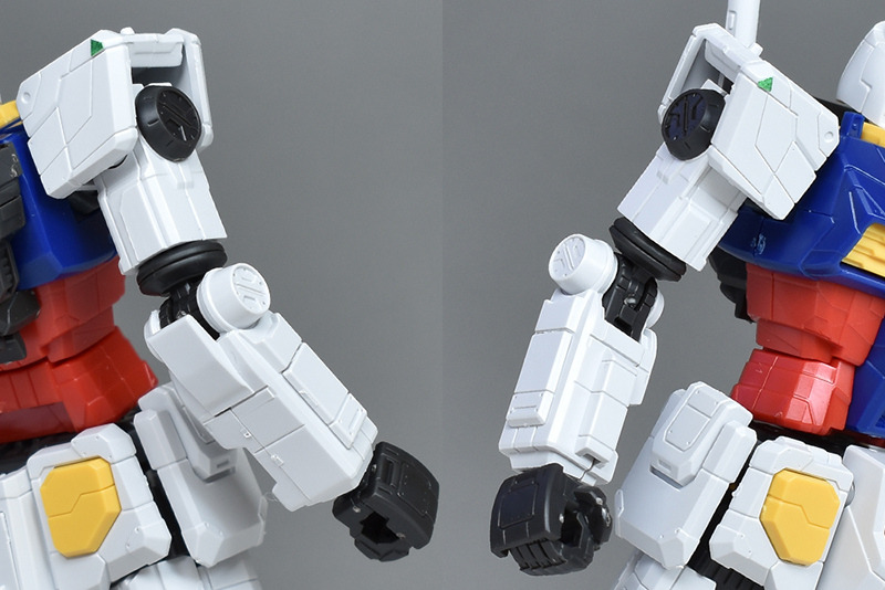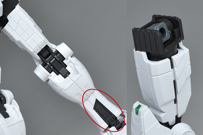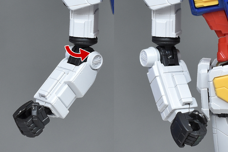 실물이 움직이는 건담과 같은 가동부인 팔꿈치측의 원형 부분이 롤 가동합니다.