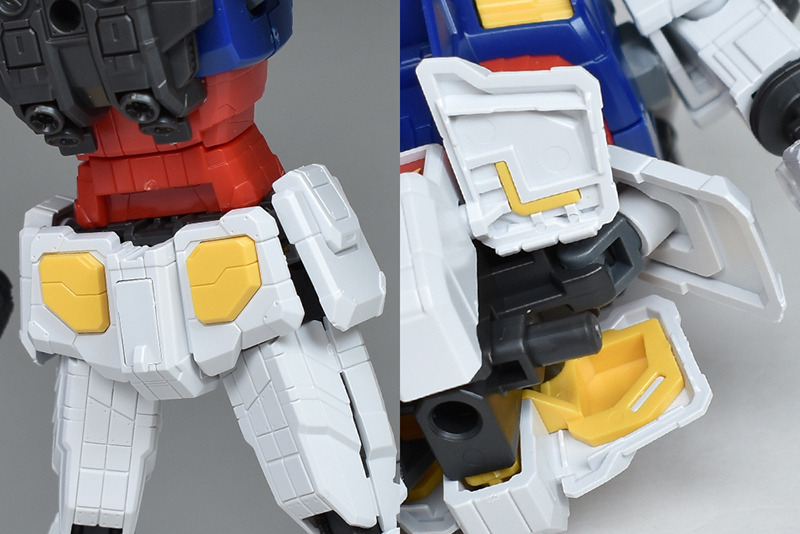 무릎은 V자 정도까지 구부리는 것이 가능. 1/100RX-78F00과 같은 대퇴부 슬라이드 특수 효과는 없습니다. 무릎 뒤는 맞추어야 합니다만, 뒷받침 부품이 조형되고 있습니다.