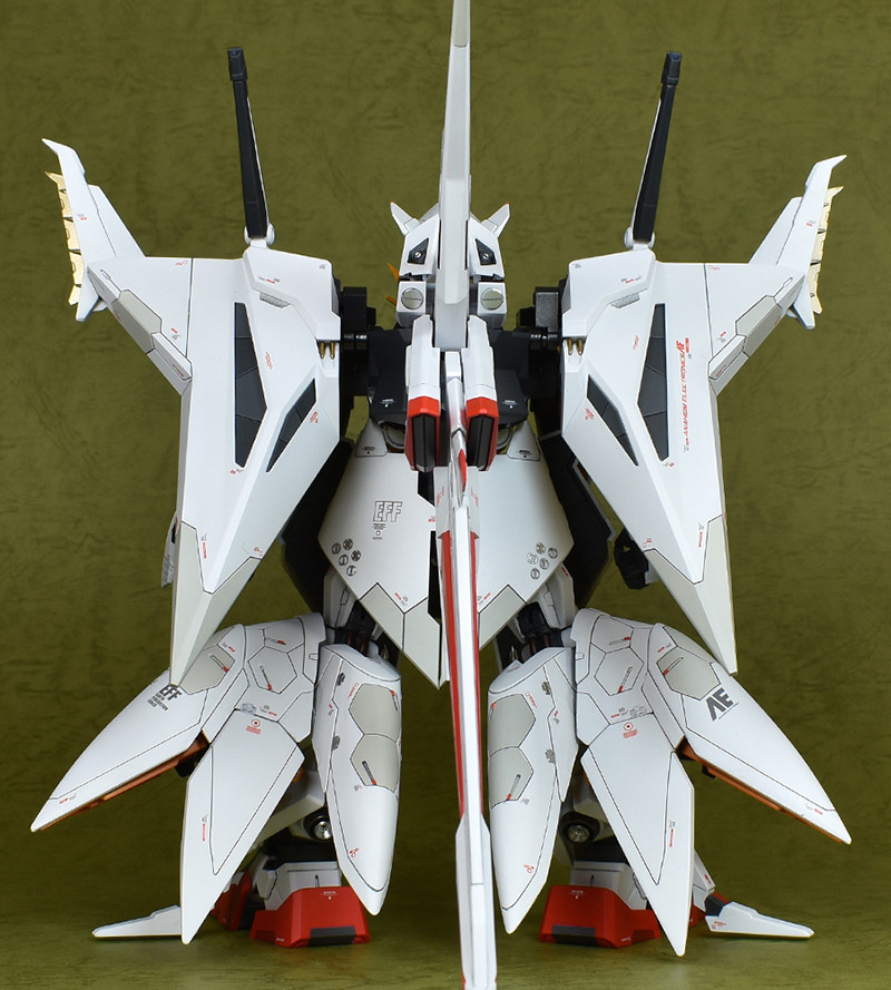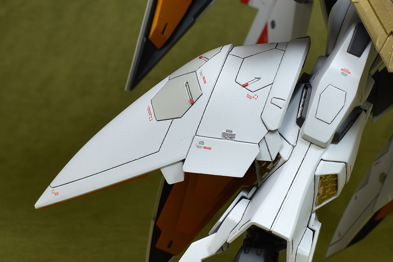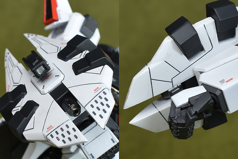 어깨 갑옷은 안팎으로 모두 눈동자를 지워버렸다. 갑옷의 일부는 메탈릭 그레이로, 붉은색 덕트 내부는 아이언으로 칠해 구분했다. 후방 갑옷은 밑단에 플라스틱 판을 덧대어 날카롭게 만들었다. 일부 회색으로 칠하고, 5개의 원형 몰드에는 지렙 02와 06을 스타브라이트 실버(가이아 컬러, 밑면은 유광 블랙)로 도색하여 접착했습니다.