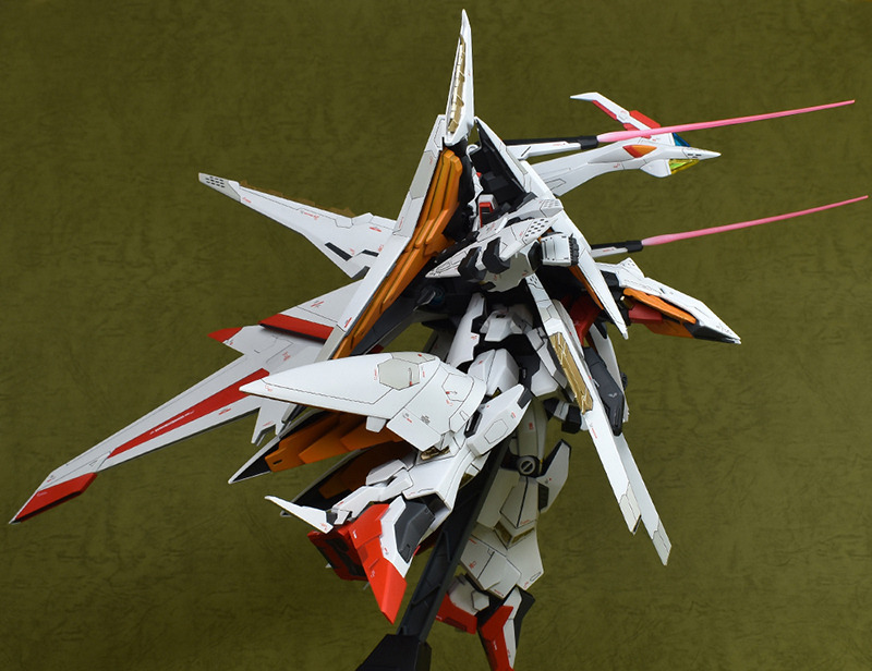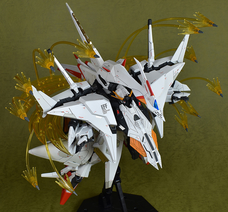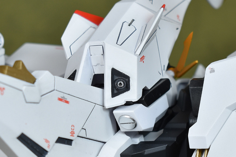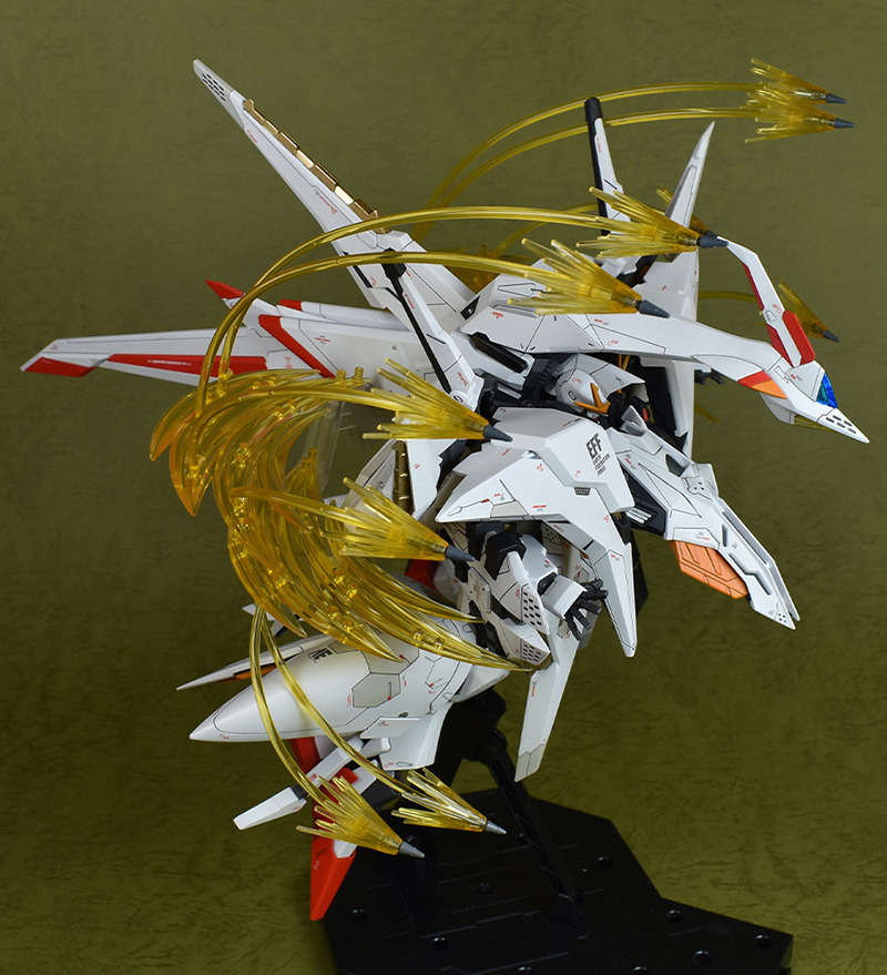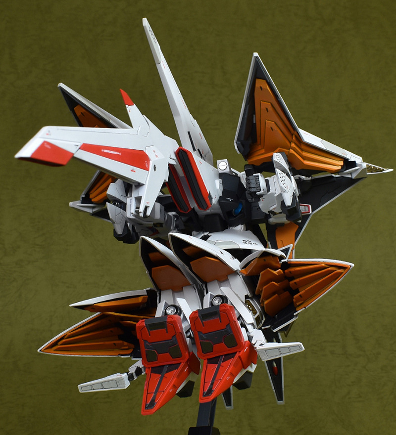 머리 부분은 토사카의 끝을 깎아 날카롭게 만들고, 안테나와 뺨의 갑옷도 플라스틱 판을 덧씌워 날카롭게 만들었다. 토사카 센서와 트윈 아이는 홀로그램 피니쉬를 붙이고 형광 클리어 레드 + GX 클리어 딥 레드로 도색했다. 블랙라이트로 비추면 발광합니다.