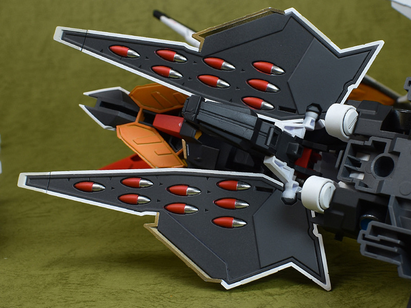테일 바인더 하부 날개는 중앙의 붉은색 갑옷 부분을 뒤쪽에서 감싸고 있습니다. 붉은색 상부 날개는 끝부분에 플라스틱 판을 덧대어 날카롭게 만들었습니다. 측면의 원형 몰드에는 하이큐파츠의 지렙06의 3.5mm를 접착했습니다.